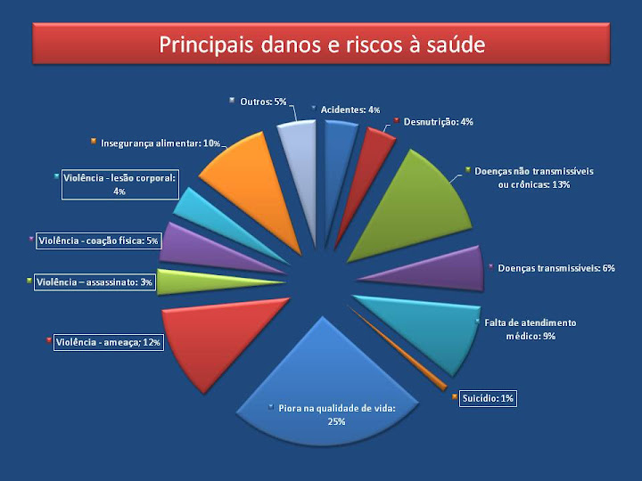 O slide mostra ainda outros tipos de violência praticados contra essas populações: a “Insegurança alimentar e desnutrição” (14%); as “Doenças não transmissíveis ou crônicas” (13%); a “Falta de atendimento médico” (9%); as “Doenças transmissíveis” (6%); os “Acidentes” (4%); e, ainda, os “Suicídios” (1%). Vale ressaltar que a maioria absoluta dos que envolvem doenças transmissíveis está ligada a povos indígenas e, principalmente, a mulheres e adolescentes contaminadas por doenças sexualmente transmissíveis, inclusive AIDS, como subprodutos da expansão agrícola e da mineração. Mais: todos os casos incluídos no item “Suicídios” dizem respeito a indígenas, que optaram por deixar de lutar pelas próprias vidas.