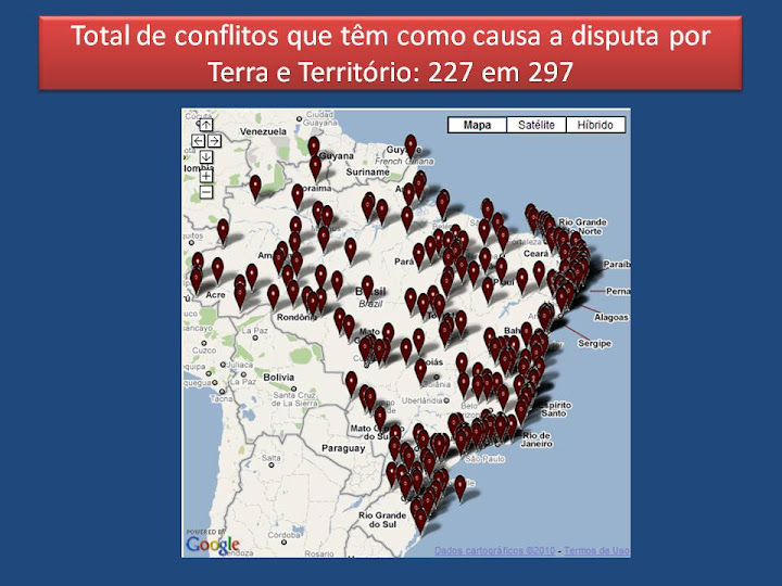 Nessa imagem, o que temos são as marcas de 227 de um total de 297 conflitos, o que corresponde a 76,5% dos casos. E vale registrar que: primeiro, muitos dos demais casos envolvem também questões ligadas a terra e território nas suas origens; e, segundo, que podemos ver um grande número desses conflitos está na zona costeira, e muitos acontecem também em áreas urbanas, como mostrarei em seguida.